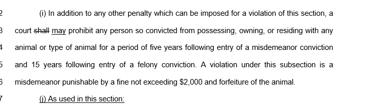 WVVAW comment: This looks like a good bill initially until you get to the penalty section and it is the deal breaker which makes one not to support. This is the deal breaker with this bill that the ‘shall’ is replaced with ‘may’ allowing for the violator to again acquire animals. That is completely unacceptable.